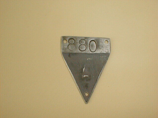 Spits toelopend aluminium plaatje met gaatjes in drie hoekpunten. De driehoek in het spitse gedeelte is grijs geschilderd; erin is de letter L zichtbaar. Boven het grijze gedeelte het nummer 880. Mogelijk afkomstig uit een concentratiekamp.