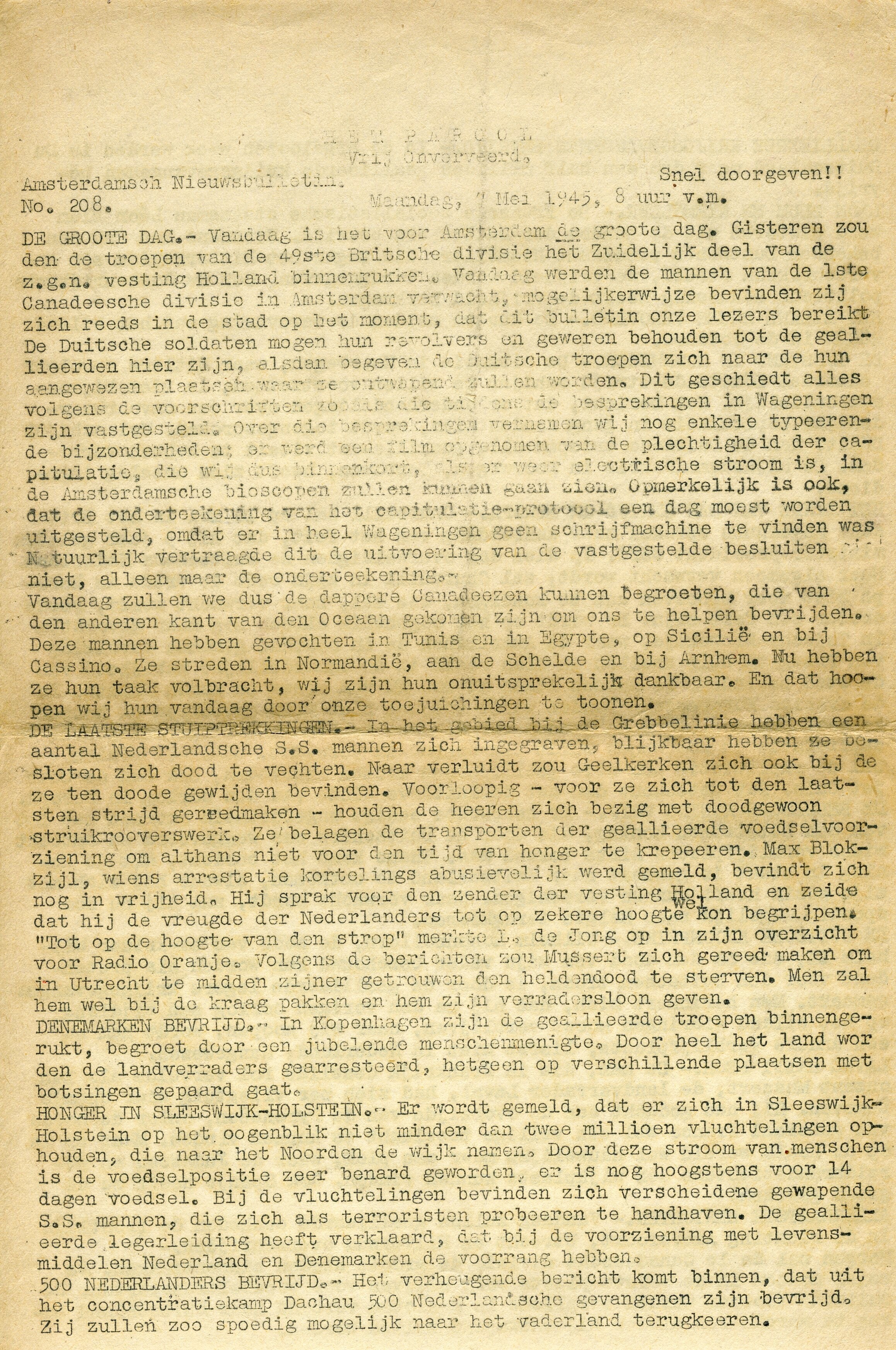 Illegale dubbelzijdig gestencilde uitgave van het ''Amsterdamsch Nieuwsbulletin'', nummer 208 van maandag 7 mei 1945, met berichten over de bevrijding van Nederland.
