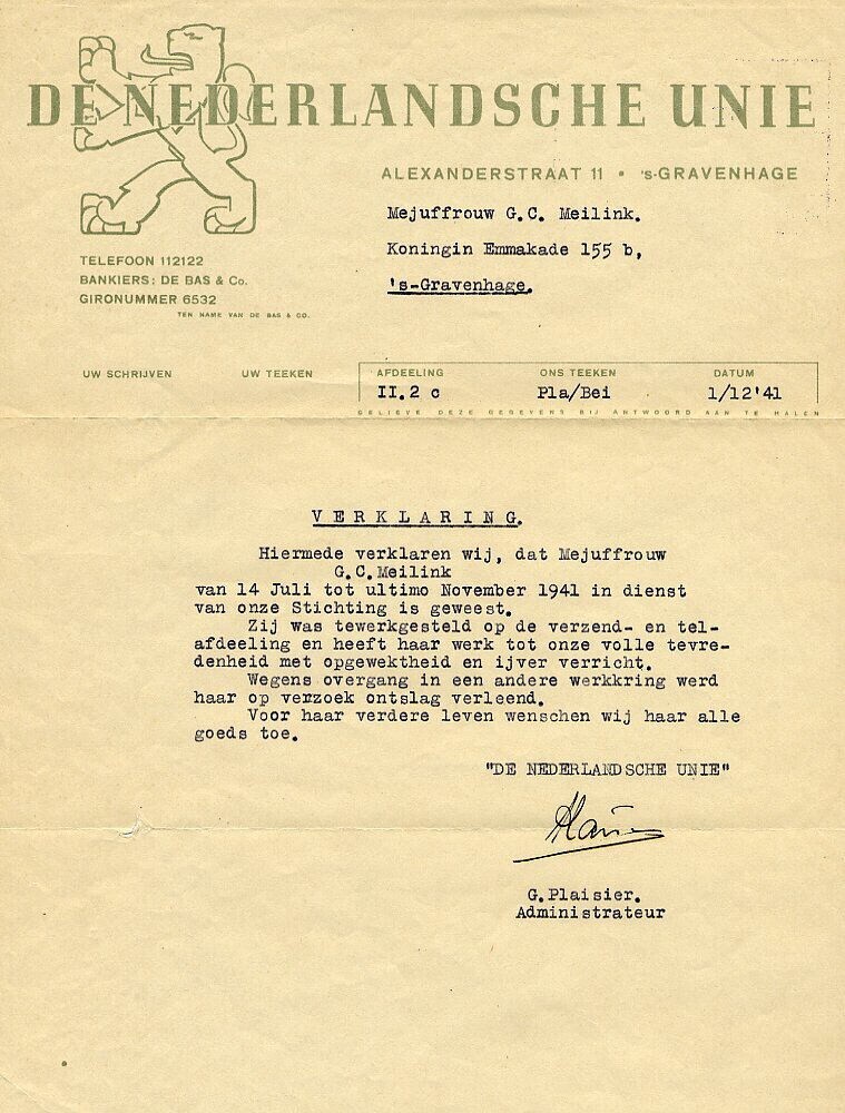 Getuigschrift van 1 december 1941waarin wordt verklaard dat mejuffrouw G.C. Meilink van 14 juli tot ultimo november 1941 bij de Stichting Nederlandsche Unie te Den Haag heeft gewerkt. Bij het getuigschrift is de blanco vensterenvelop toegevoegd.