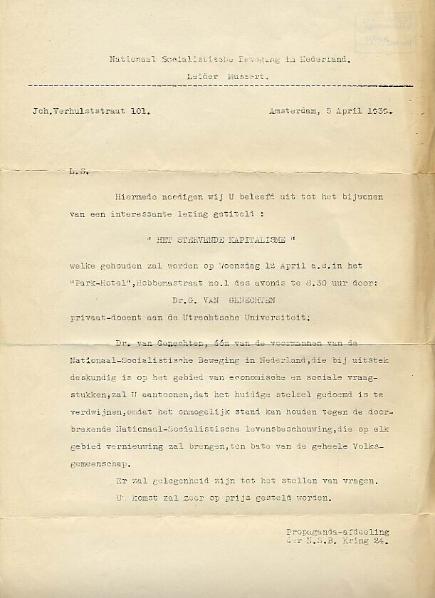 Een gestencilde uitnodiging voor een lezing met als titel "Het Stervende Kapitalisme" door Dr. G. van Genechten in Amsterdam.