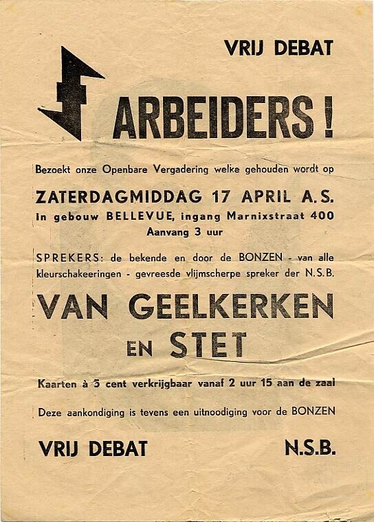 Blad met bovenaan de afbeelding van de wolfsangel en daarna: "Arbeiders!" en daarna de aankondiging van een door de N.S.B. georganiseerd debat in Amsterdam. Op de achterkant een getekend portret van Mussert.