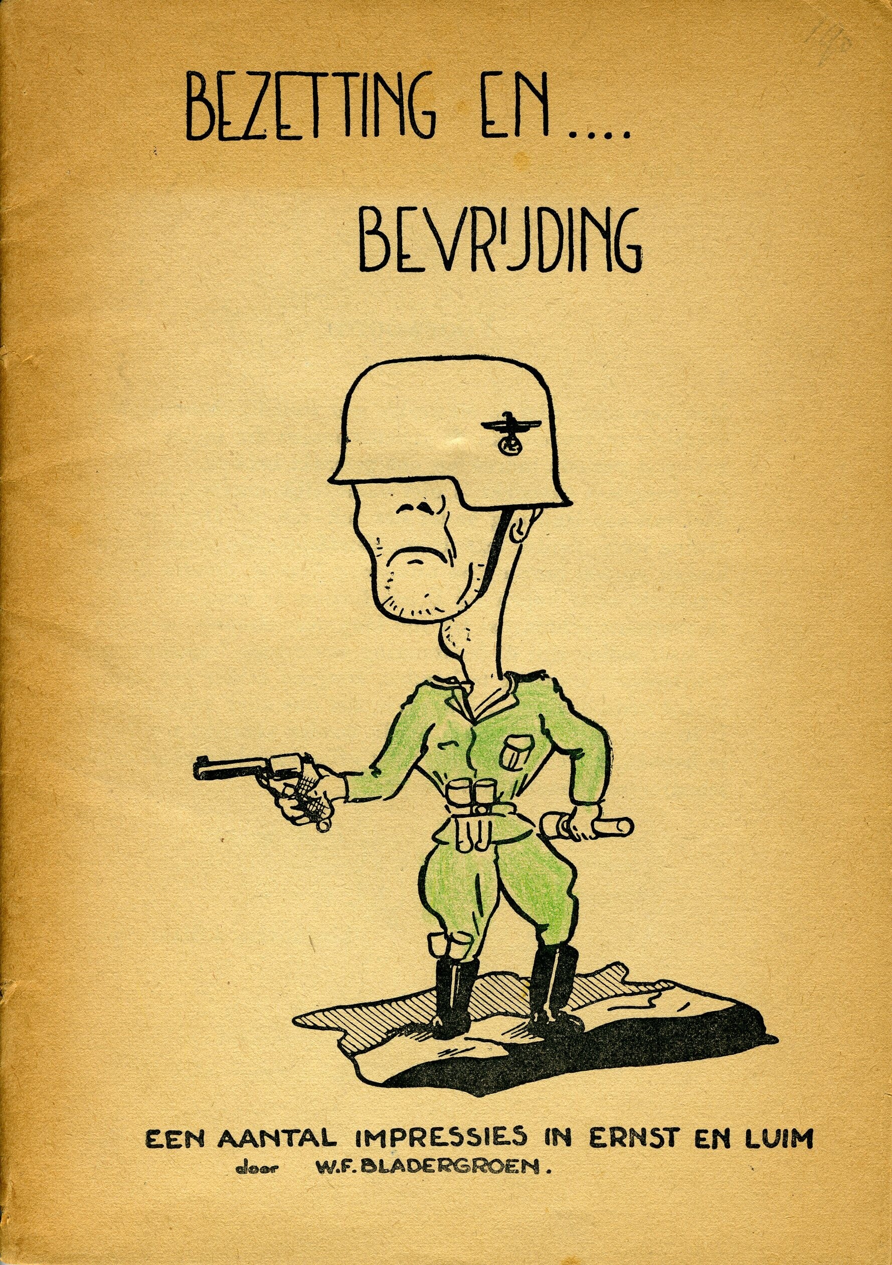Een boekje met spotprenten over de Duitse bezetting. Op de voorkant een karikatuur van een Duits militair, met de hand groen ingekleurd, staand op de Nederlandse vlag.