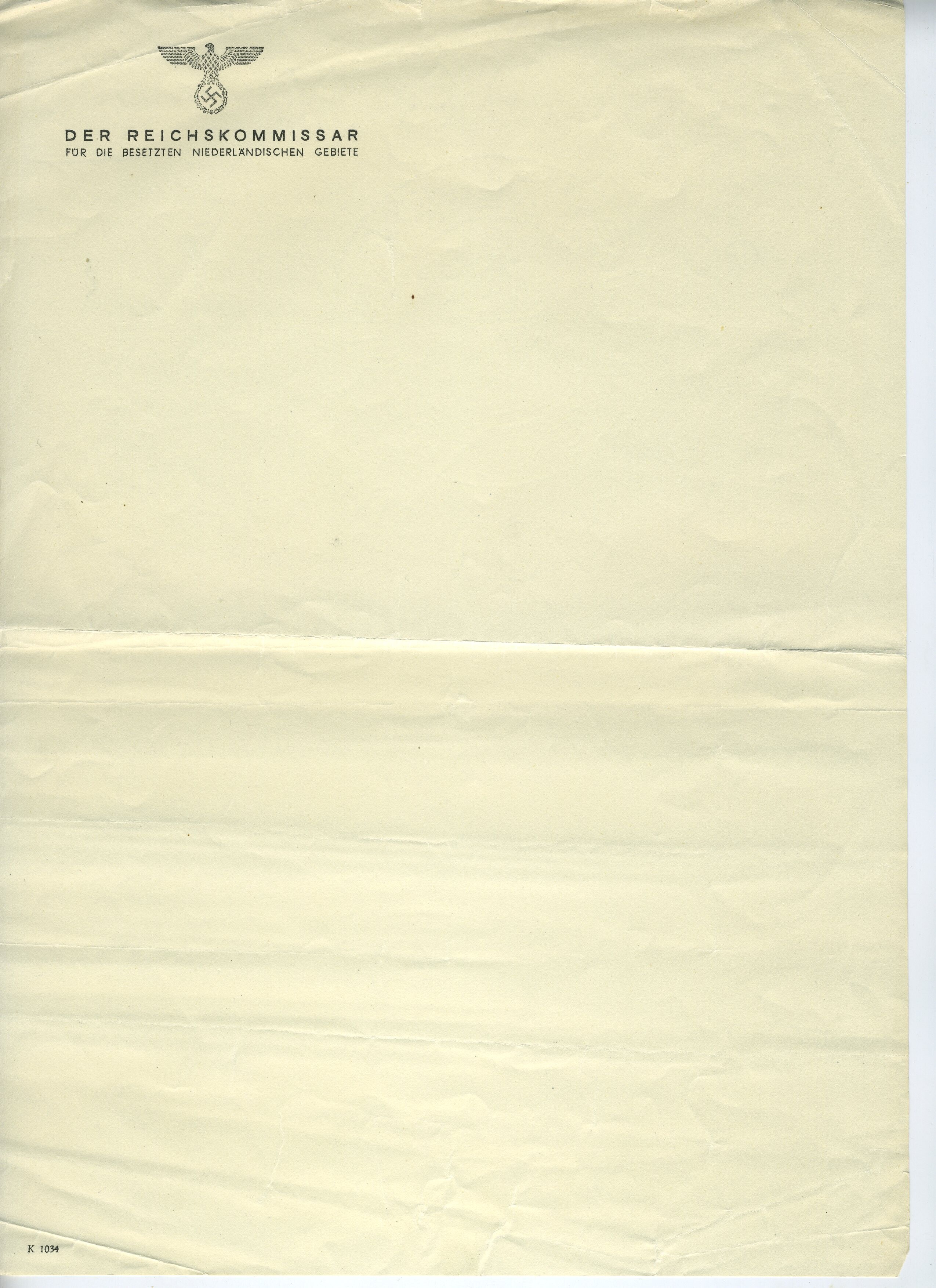 Twee vel blanco briefpapier met in het briefhoofd de Duitse adelaar met hakenkruis en de tekst: "Der Reichkommissar füÂr die besetzten Niederlandischen Gebiete".