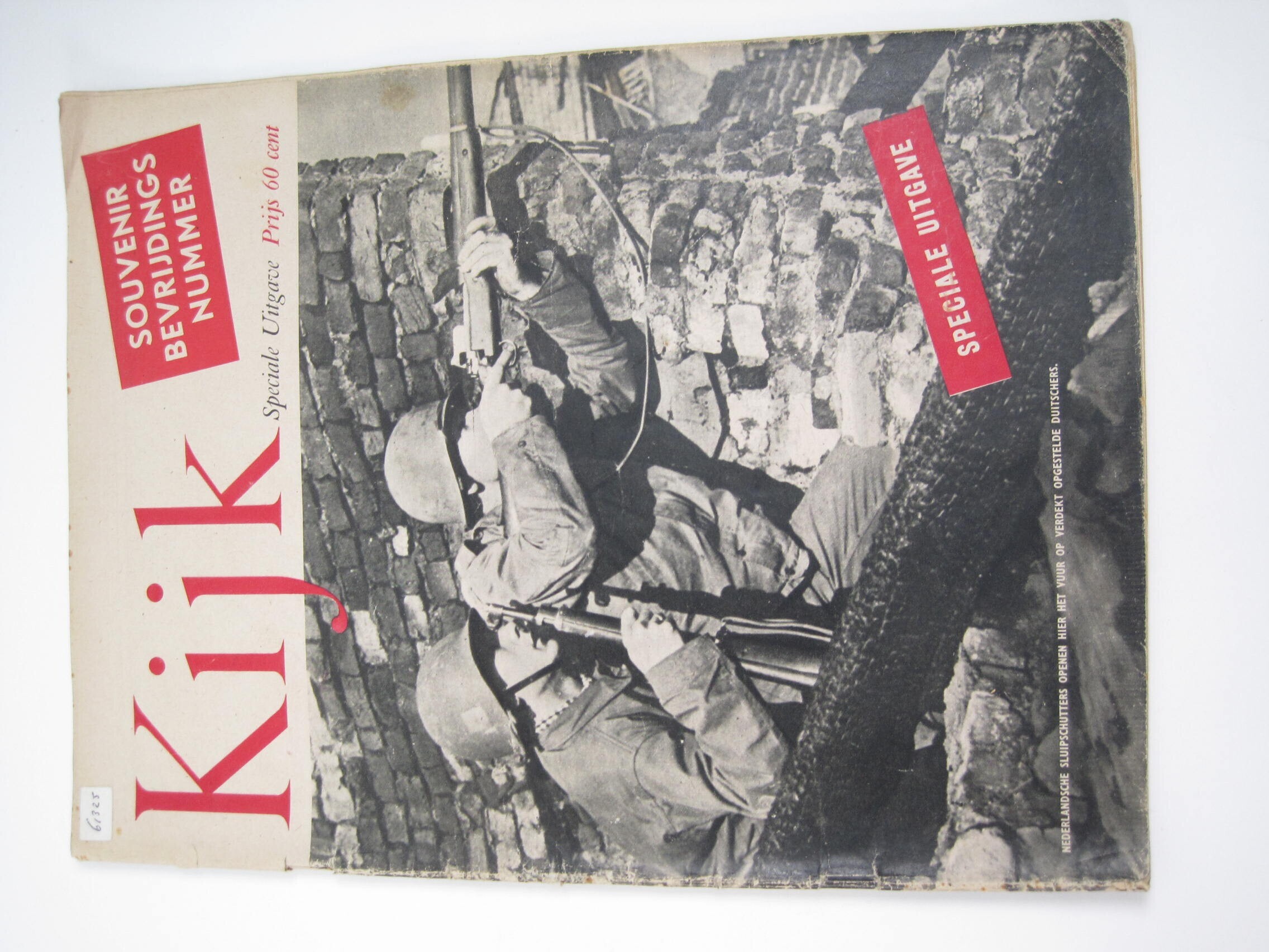 Twee uitgaven van het met veel zwartwit foto's geïllustreerde tijdschrift "Kijk. Het heden in woord en beeld" uitgegeven door het Amerikaanse Ministerie van Voorlichting voor Nederland en België in 1944 tot eind 1945. Het gaat om het laatste nummer: het "Souvenir Bevrijdingsnummer Speciale uitgave".