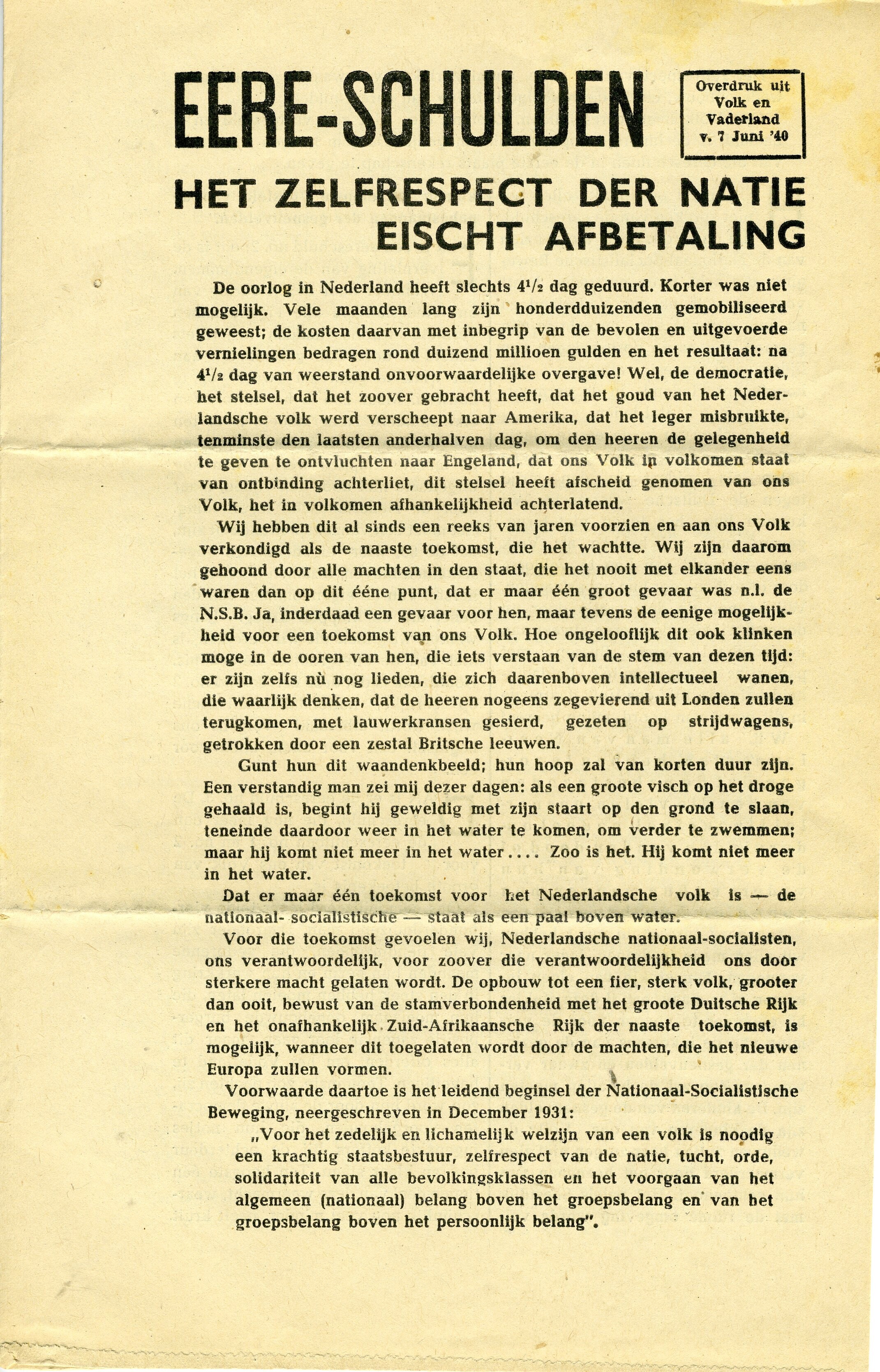 Pamflet van vier pagina's met een overdruk uit 'Volk en Vaderland' van 7 juni 1940. Het gaat om de 'ereschuld' ten opzichte van de nabestaanden van de slachtoffers van 10 tot 15 mei 1940.