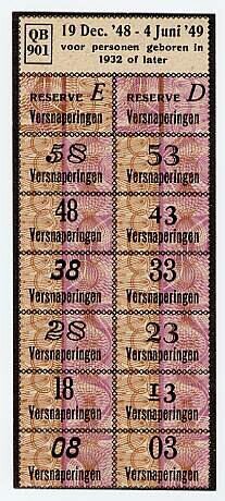 Twee bonkaarten voor versnaperingen "voor personen geboren in 1932 of later", serie QB901, geldig van 19 december 1948 tot en met 4 juni 1949.