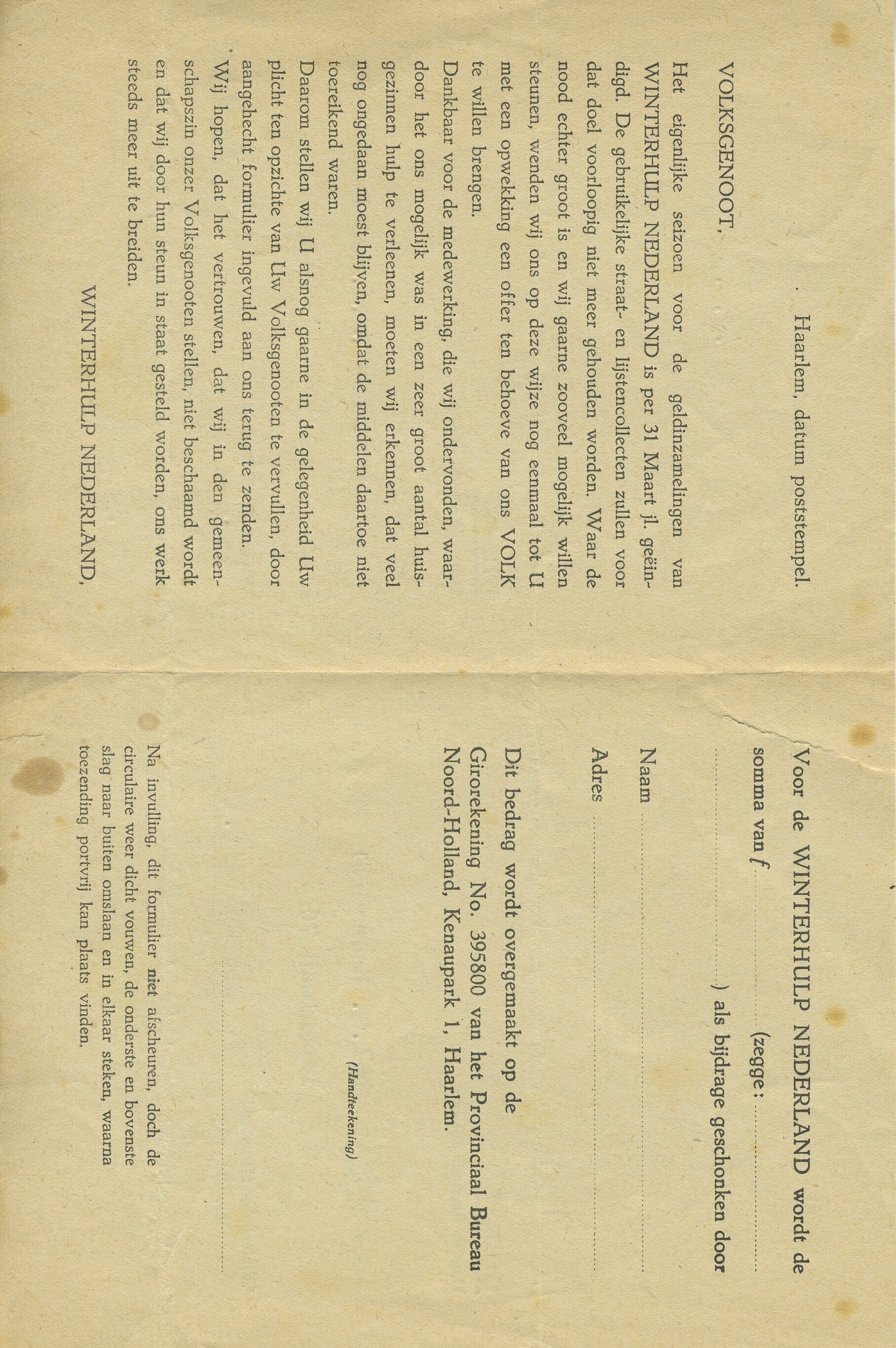 Schrijven gericht aan P. Haanappel te Bloemendaal met een oproep om geld te schenken t.b.v. de Winterhulp Nederland en een kaart die aan de organisatie kan worden geretourneerd met daarop het bedrag dat wordt gegeven.