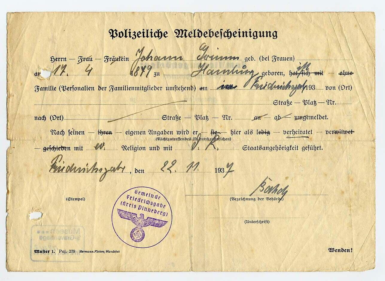 Duitstalige uittreksel uit het bevolkingsregister op naam van Joann Grimm, afgegeven door de gemeente Friedrichsgabe.
