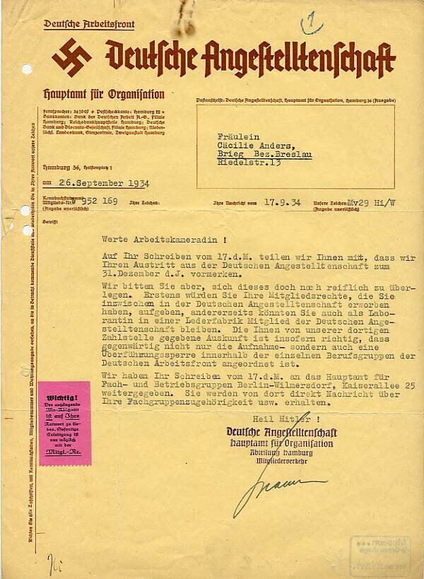 Twee brieven en een briefkaart van de "Deutsche Angestelltenschaft" in het "Deutsche Arbeidsfront", gericht aan C. Anders.