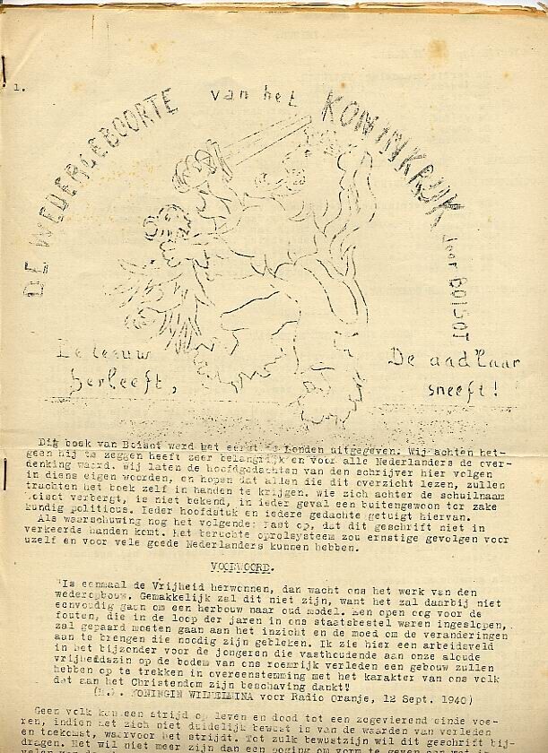 Gestencilde versie van ''De wedergeboorte van het Koninkrijk'' geschreven door Boisot. Op de losse kaft is de Nederlandse Leeuw getekend. De uitgave omvat 17 getypte pagina's.