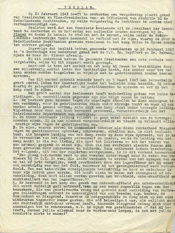 Doorslag op vier pagina's van een verslag van een vergadering en protestbrief van leden der arrondissementsrechtbank te Amsterdam in verband met wantoestanden in interneringskamp Ommen.