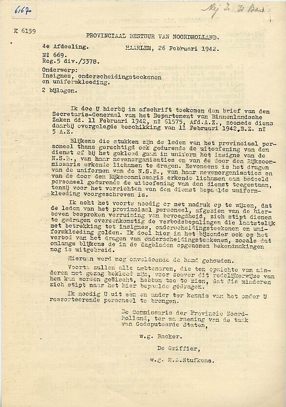 Drie documenten aan het personeel van de Provincie Noord Holland met betrekking tot de verhouding tot de N.S.B. Een afdruk van het gewijzigde ambtenarenreglement van het Departement van Binnenlandsche Zaken.