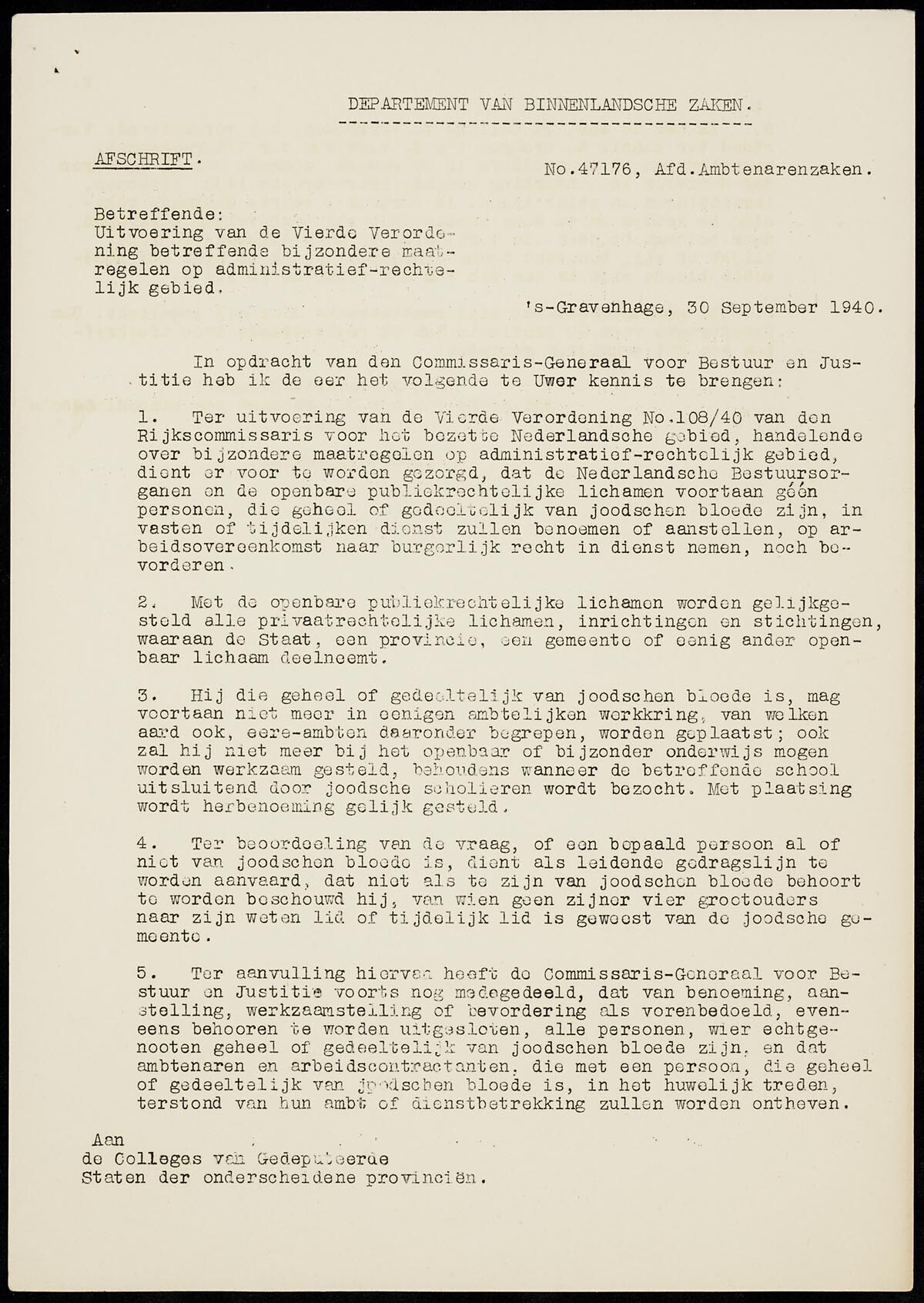 Een viertal circulaires van de 'Provinciale Waterstaat van Noordholland' en het 'Departement van Binnenlandsche Zaken' met betrekking tot de vereise ariërverklaring.