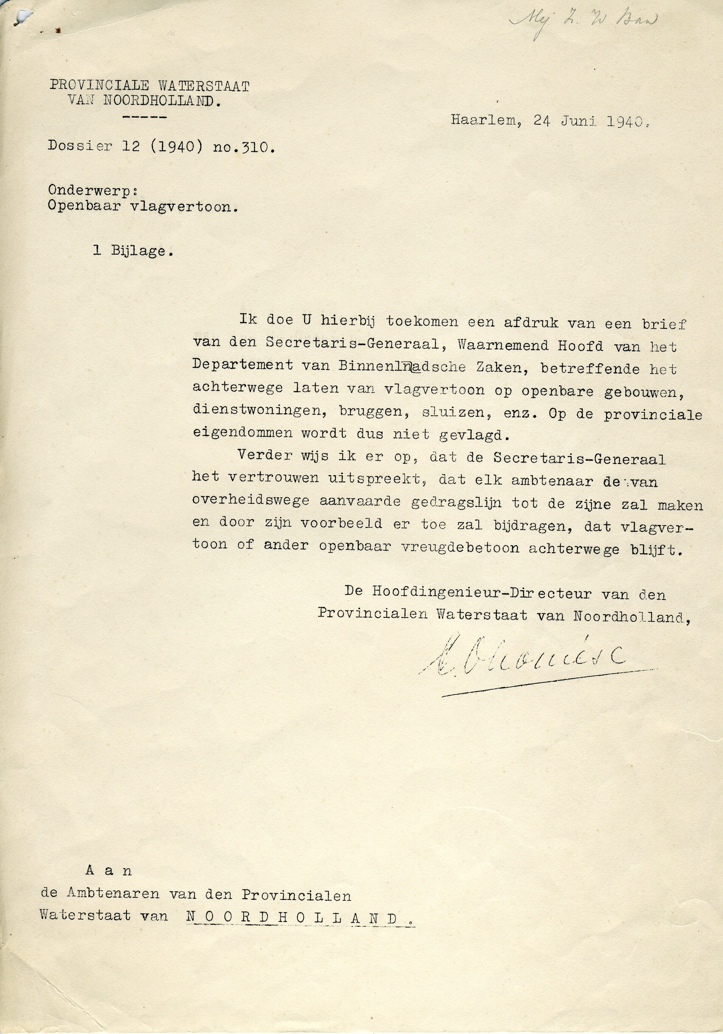 Twee brieven uit juni 1940, met daarin de opdracht voorlopig geen nationale vlaggen meer uit te steken.