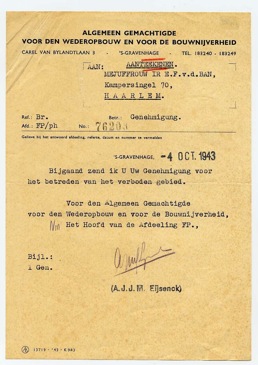 Met schrijfmachine geschreven brief met briefhoofd van de "Algemeen gemachtigde voor den wederopbouw en voor de bouwnijverheid", gericht aan mej. Ir. E.F. van den Ban in Haarlem. Tekst: "Bijgaand zend ik u Uw Genehmigung voor het betreden van het verboden gebied". Het document is gedateerd 4 oktober 1943 en ondertekend door A.J.J. Eijsenck.