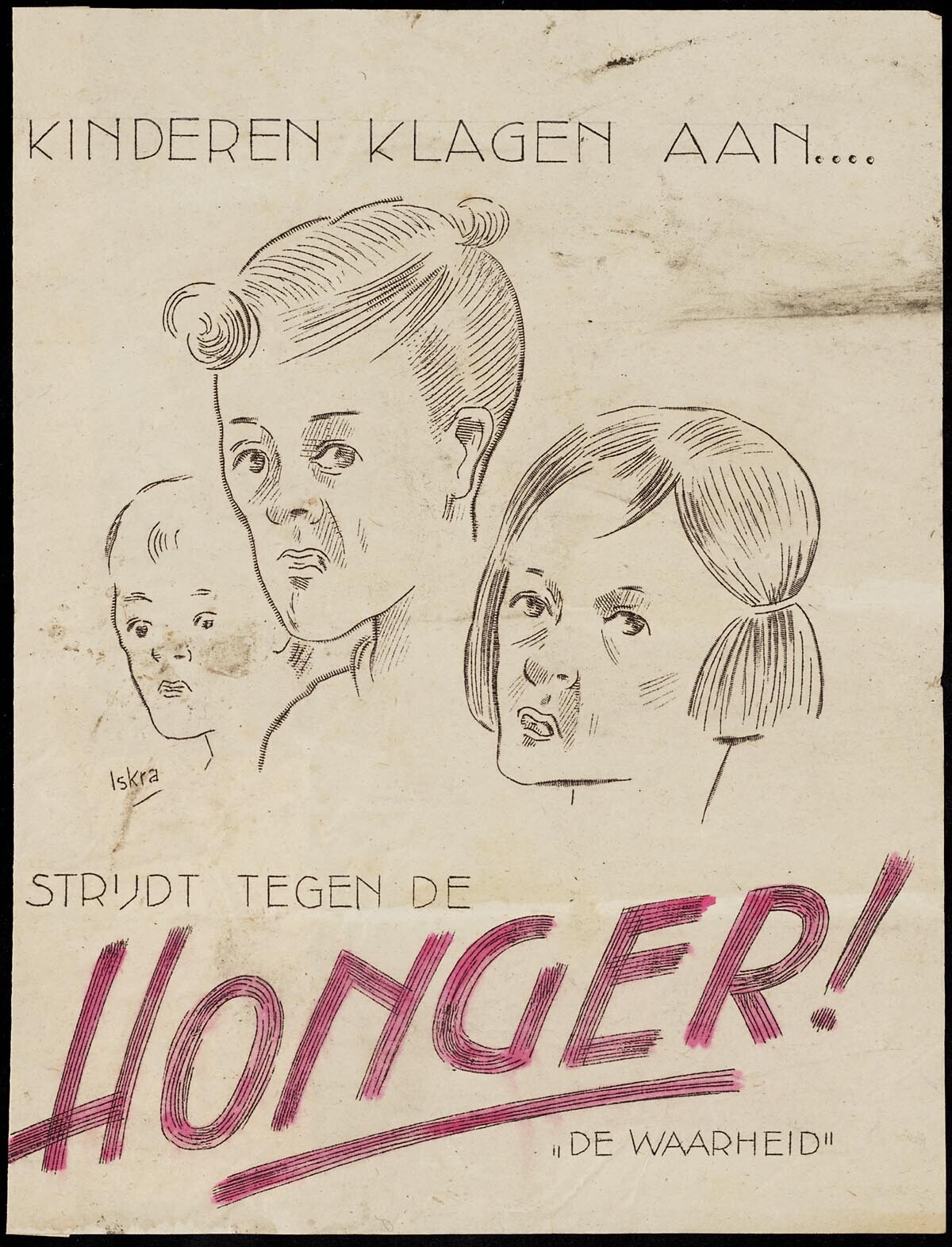 Een pamflet verspreid door de verzetskrant "De Waarheid" met de afbeelding van drie kinderportretten, gesigneerd "Iskra" en de tekst: "Kinderen klagen aan.... Strijdt tegen de honger!"