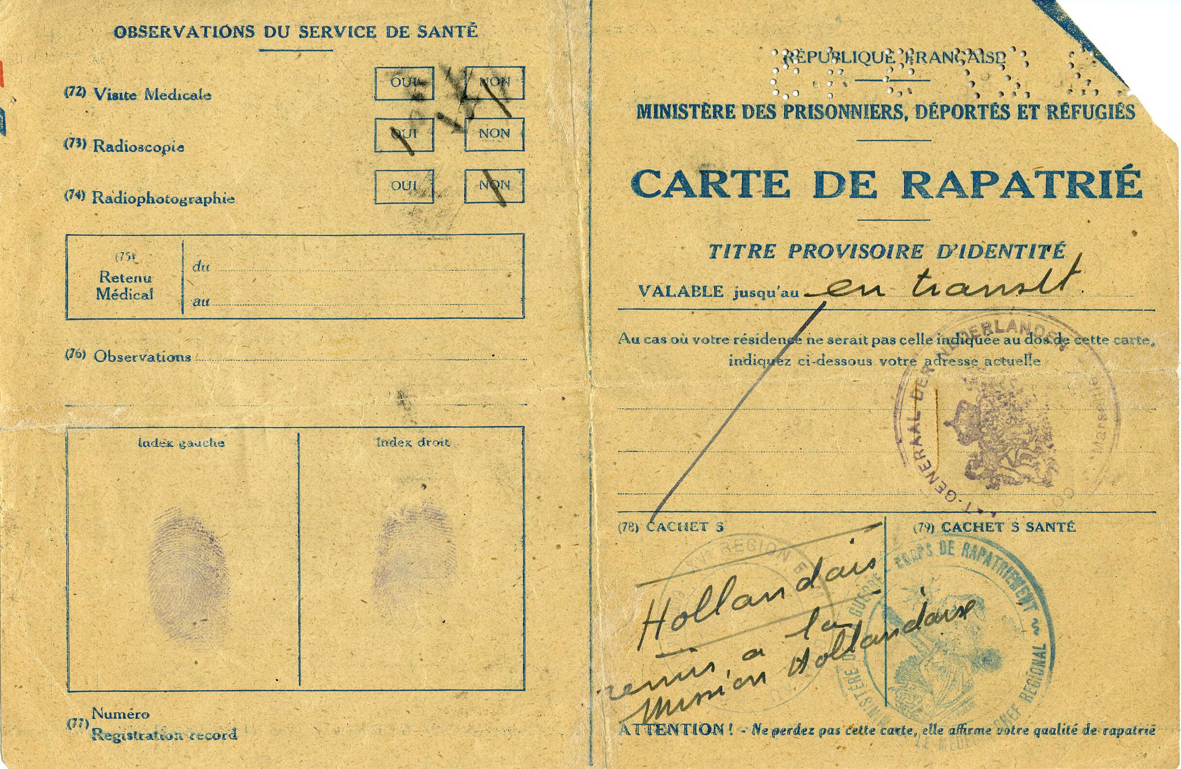 Allied Expeditionary Force D.P. Registration Record op naam van Otto Frank, uitgereikt in Lustin (België), d.d. 29 mei 1945. Kaarten zoals deze werden door de Geallieerde troepen in Europa uitgegeven aan de vele vluchtelingen en ontheemden die na het einde van de Tweede Wereldoorlog terug naar hun vaderland keerden. Otto Frank kreeg, na zijn bevrijding uit Auschwitz en tocht terug naar Amsterdam, dit document. Het diende als identiteitskaart tijdens zijn reis naar Nederland, en Otto Frank kreeg op die tocht meerdere van dit soort documenten.