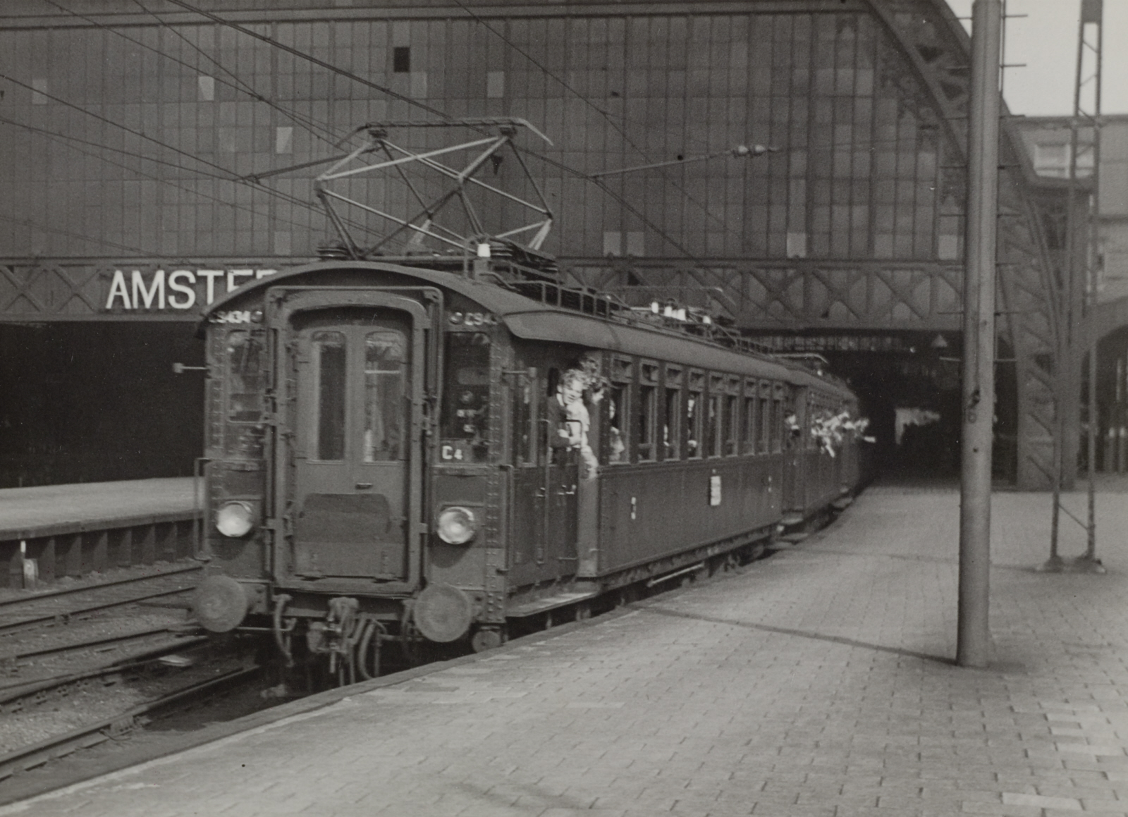 Op bruin papier geplakte afbeelding in zwart-wit met als voorstelling kinderen en volwassenen in een elektrische trein van het type Mat '24 of 'Blokkendoos' 2e klasse. De kinderen in de trein kijken naar of richting de camera. Onder de foto is met zwarte pen het nummer 6449 geschreven. Om de foto heen is met blauwe stempel vier keer 'geen negatief' aangebracht. Op de achterkant van de afbeelding een rood stempel 'Foto / Ned. Spoorwegen / Gerdessen' en een rood stempel 'Dienst van Economische Zaken / 6e Afdeeling / Foto- en Documentatie Bureau' met datum 16 juni 1948.
