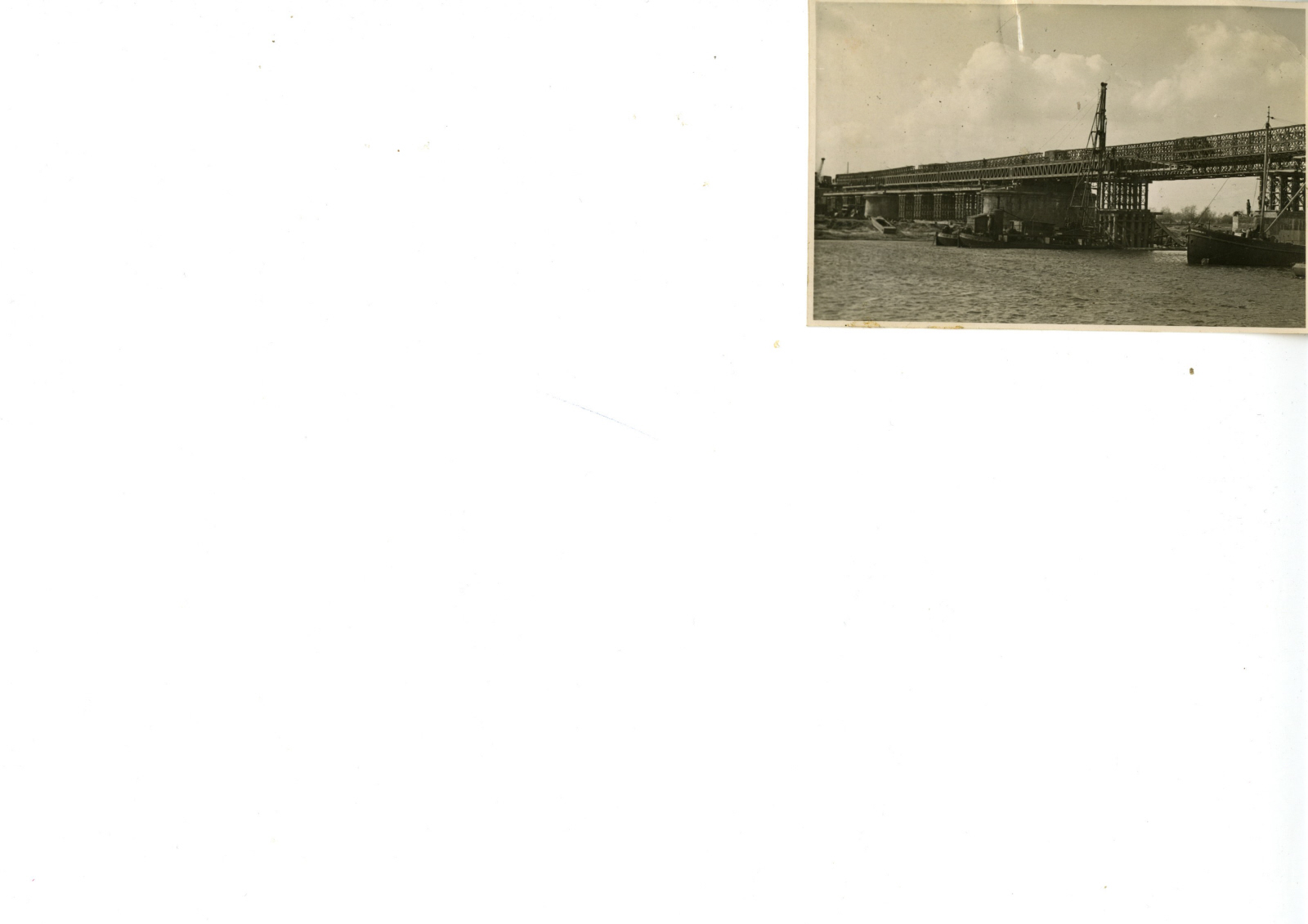 Foto in het zwart wit van een spoorbrug in Gennep. In deze foto worden de herstelwerkzaamheden in beeld gebracht. Te zien is de brug die op tijdelijke steunpijlers staat waar boten langsvaren. Bijschrift achterzijde: ''Gennep - 410 feet of girders move across the gaps - 19 march 1945''.