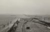Op bruin papier geplakte afbeelding in zwart-wit van verschoven rails van een ondergelopen baanvak bij Lage Zwaluwe. Links ligt overstroomd gebied. Rechts liggen kiezels op de oever.