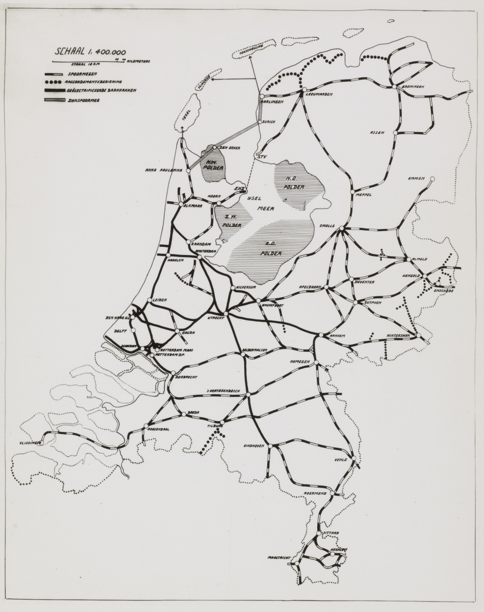 Afbeelding in zwart-wit van een kaart van Nederland met daarop sporen voor goederenvervoer, geëlektrificeerde bakken al dan niet in voorbereiding daartoe, en dijkspoorwegen. De kaart laat de situatie zien op juni 1941.