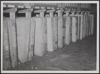 Voor- en achterzijde van een foto in zwart wit van een opslagplaats voor stenen en hout bij moerdijk voor het herstel van de brug over het Hollands Diep. Een auto met het reservewiel op de achterklep staat geparkeerd tussen stapels hout en loodsen. Stukken rails en kiepwagens staan op het terrein. De foto is op lichtgekleurd papier geplakt en heeft een stempel met daarop de tekst: 'Opname gemaakt door Martelhoff's Circuline Fotosysteem. Negatiefformaat: 6x6. Datum: J Opject 19 No. i'.