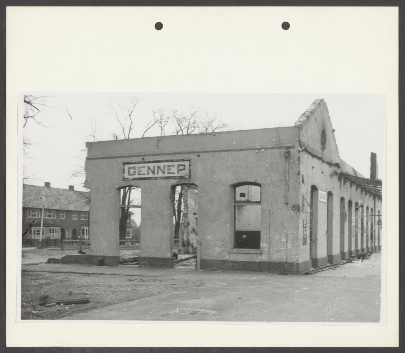 Foto in zwart wit van het verwoeste stationsgebouw van Gennep en de directe nabijheid daarvan. Het dak is eraf, de vensters en deuren zijn weg. Een deel van de achtergevel is weg. Op de gevel hangen emaillen reclameborden voor 'de eerste Nederlandsche levensverzekerings-bank' en 'verzekeringsmaatschappij 'Groningen' voor runderen en vee. Op de gevel zitten brandvlekken. De perronoverkapping is weg. Het gebouw is verwoest tijdens oorlogshandelingen. De foto is op lichtgekleurd papier geplakt en heeft een stempel met daarop de tekst: 'Opname gemaakt door Martelhoff's Circuline Fotosysteem. Negatiefformaat Leica Datum: L Opject 79 No. 19'.