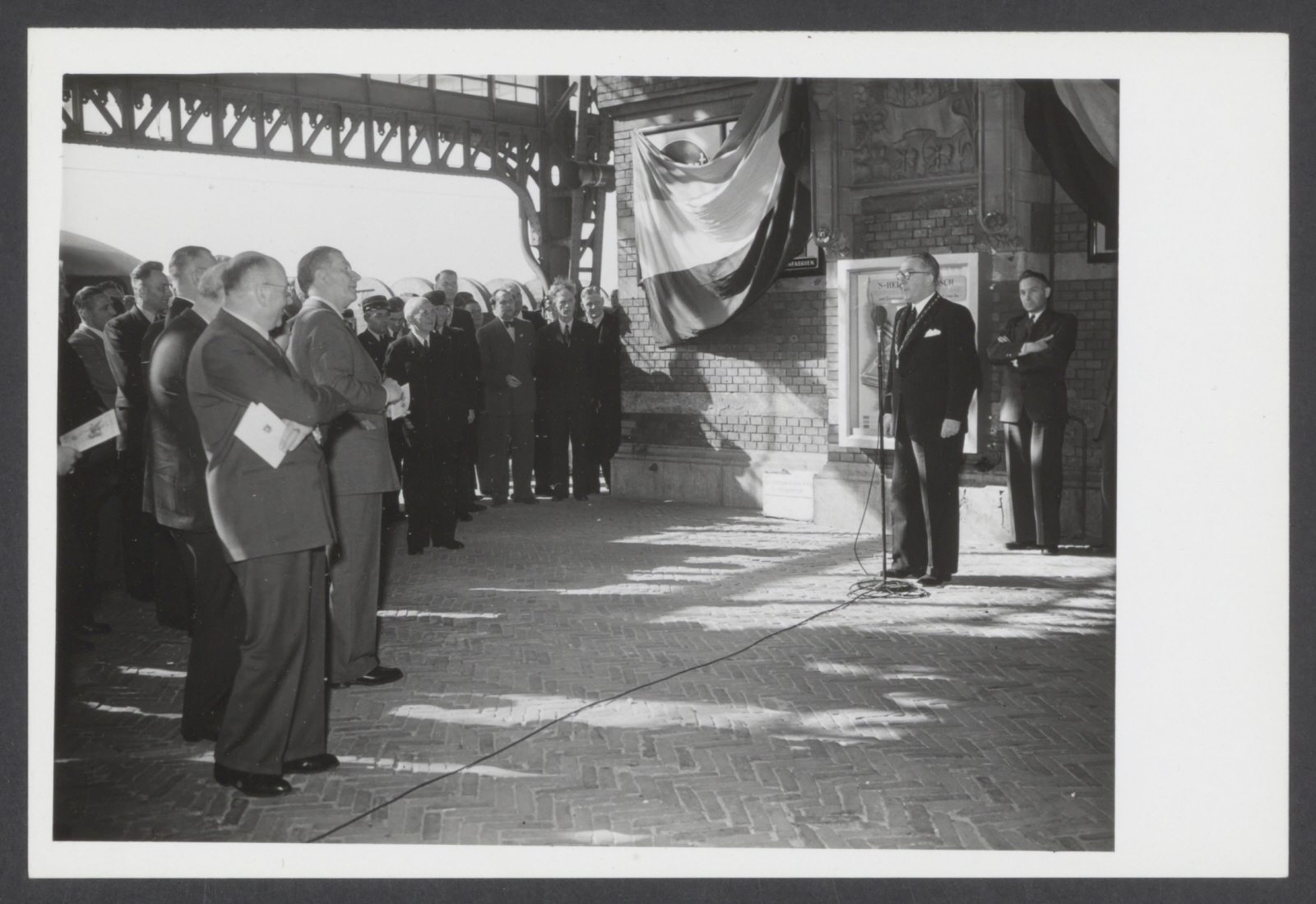 Foto in zwart-wit van burgemeester Herman Witte die directieleden van de Nederlandse Spoorwegen toespreek op het station van Bergen op Zoom op 11 mei 1950. Achter de burgemeester staan genodigden op een perron.