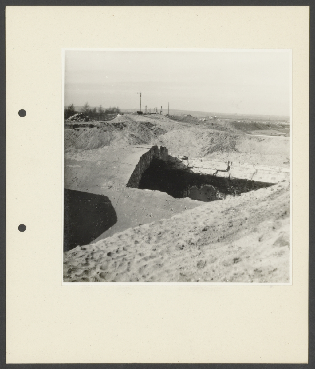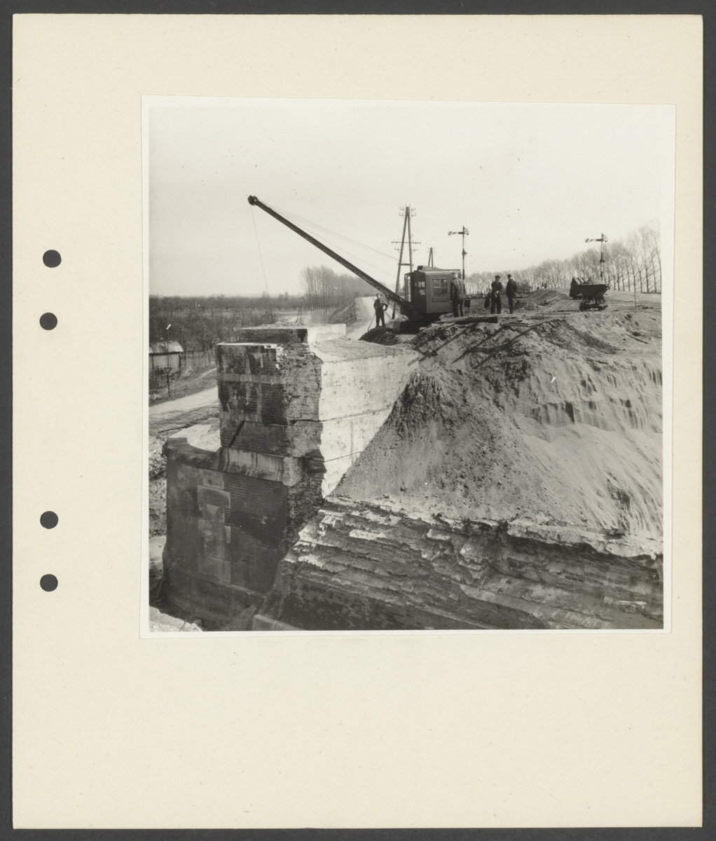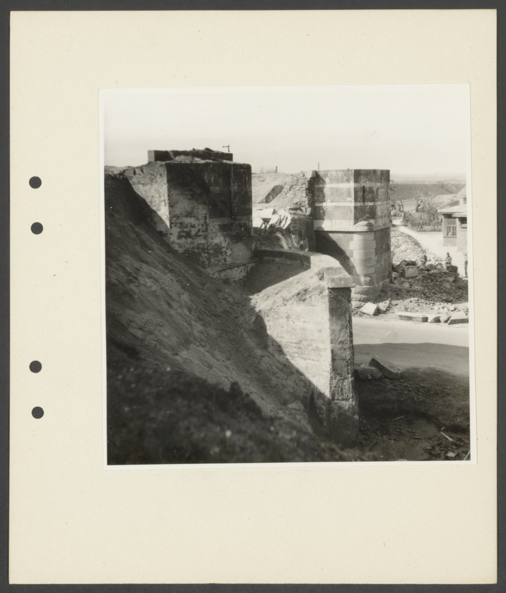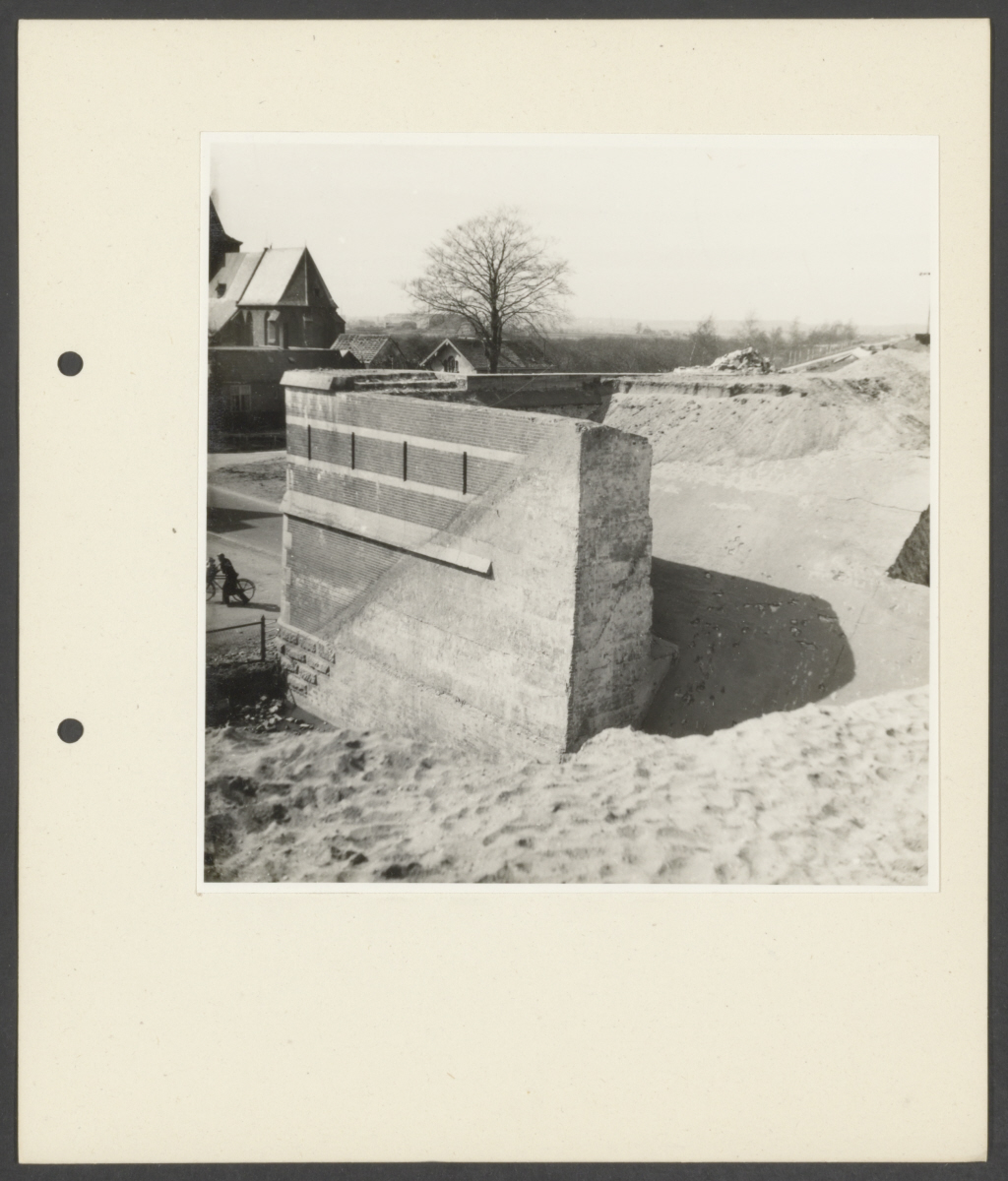 Een op gekleurd papier geplakte zwart wit foto van de oorlogsschade aan het viaduct op de Dorpstraat in Westervoort, gezien vanaf het verwoeste talud. De brug is aan de bovenkant beschadigd en een deel van het talud is weg. De herstelwerkzaamheden worden uitgevoerd door 'Aannemersbedrijf Dirk Verstoep' uit Den Haag. De andere zijde van het viaduct, niet op de foto zichtbaar, is bijna ongeschonden. Op de achterzijde in blauw een stempel met daarop de tekst: 'Opname gemaakt door Martelhoff's Circuline Fotosysteem. Negatiefformaat 6x6 Datum: N. Opject 84 No. 7'.