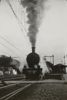 Op bruin papier geplakte zwart-witfoto van een stoomlocomotief die uit de schoorsteen en uit andere delen een grote rook- en stoomdampontwikkeling laat zien.