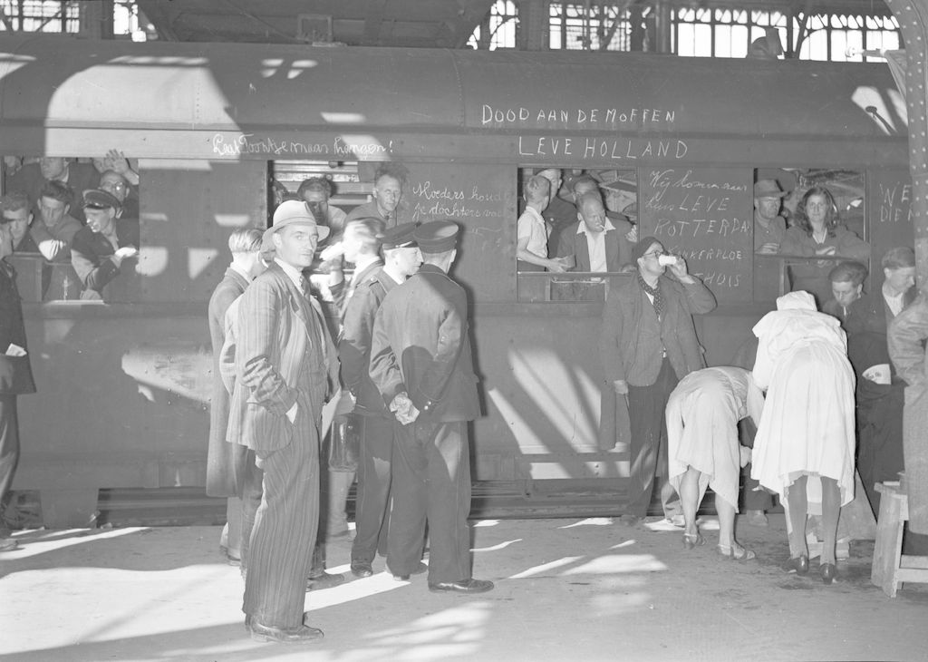 Afbeelding van de aankomst van gerepatrieerden uit Duitsland met de trein op het N.S.-station Utrecht C.S. te Utrecht.