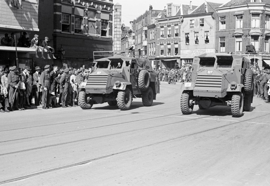 Afbeelding van de Memorial D-Day Parade met militairen van de 3rd Canadian Infantry Division op de Neude te Utrecht; op de achtergrond de Voorstraat. Digitale reproductie van een door J.P. Hogeweg in mei 1945 gemaakt kleinbeeldnegatief.