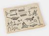 In houten kist twee lagen met vakverdeling. In vakjes meccano: moeren, schroeven, wielen, grondplaten enz. Één instructieboekje, bruin met zwart beslag. Boek nr 1: groen fond waarop twee jongens die, op hun buik liggend, een hijskraan bouwen.