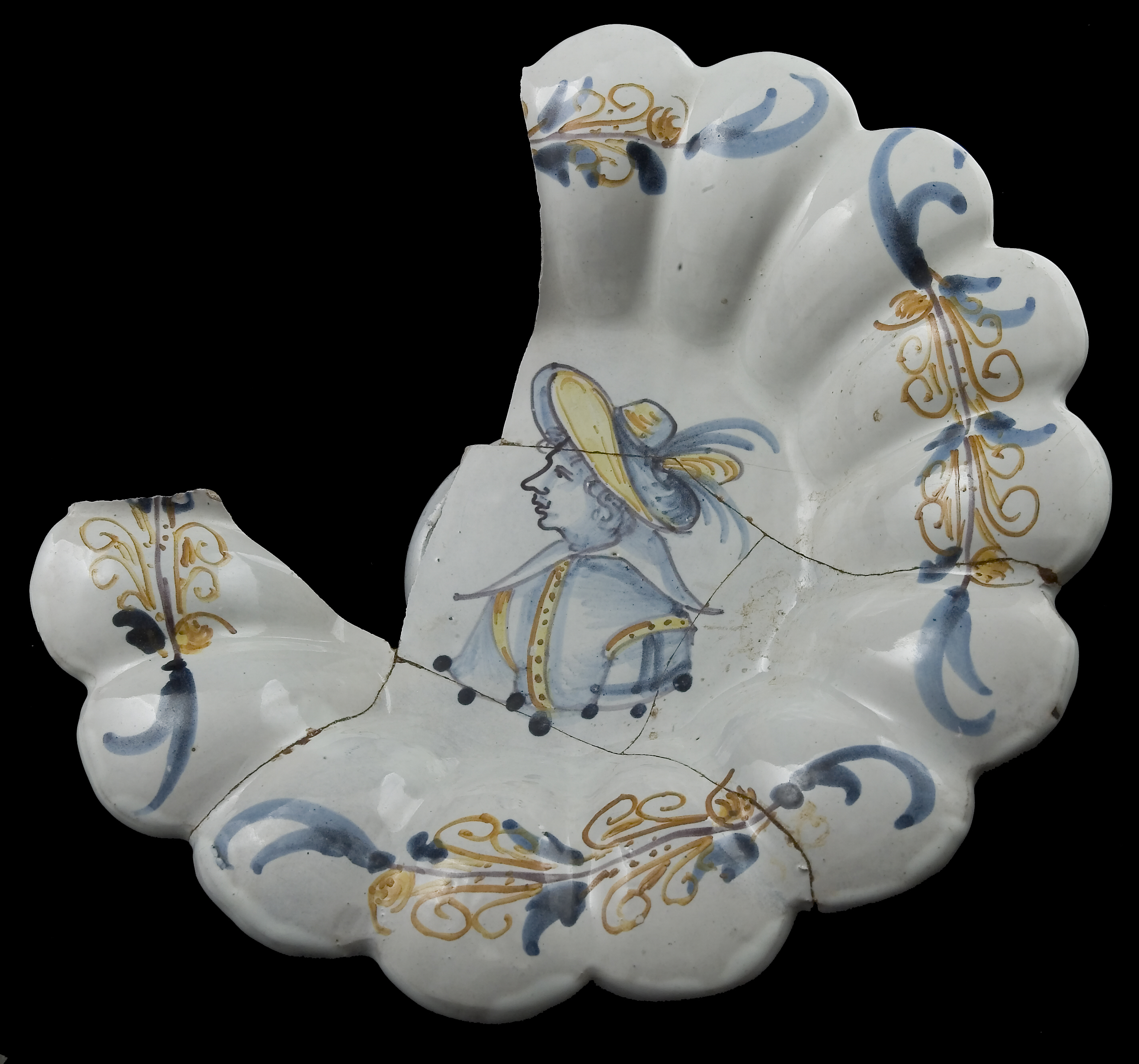 Fragment majolica schotel, polychroom, Chinees decor met artemisiablad