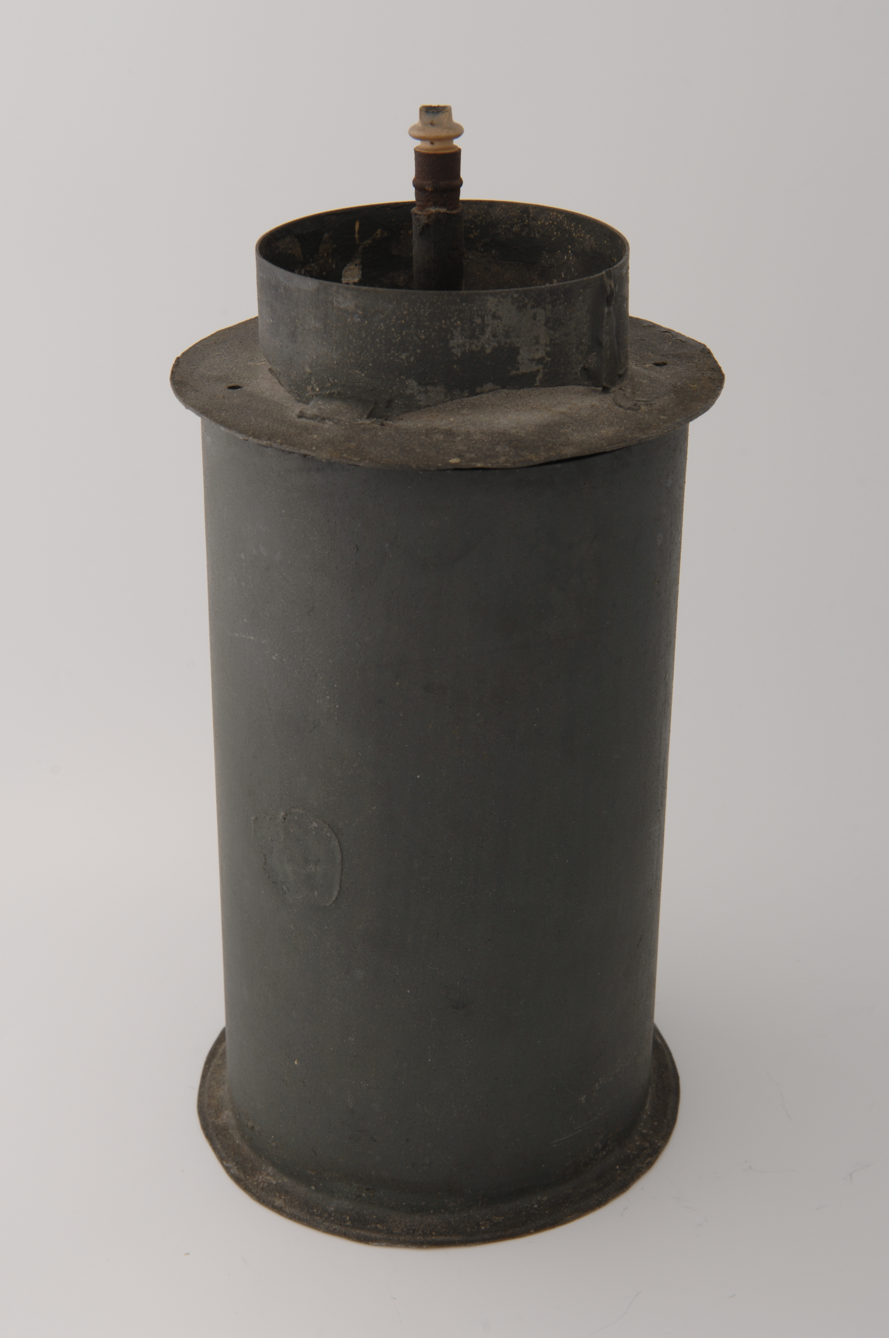 Gesloten cilinder met omgefelste onderrand en oor (1), afneembare overkragende deksel (2) waaronder een dubbele cilinder is bevestigd, die in het lamplichaam past; op het deksel een rechtopstaand pijpje gesoldeerd met twee gaatjes aan het uiteinde. In de cilinder een los, op een ronde voet gemonteerd hol pijpje (3), waaromheen een losse, geperforeerde mantel (4). Buitenzijde van de lamp rood geschilderd.