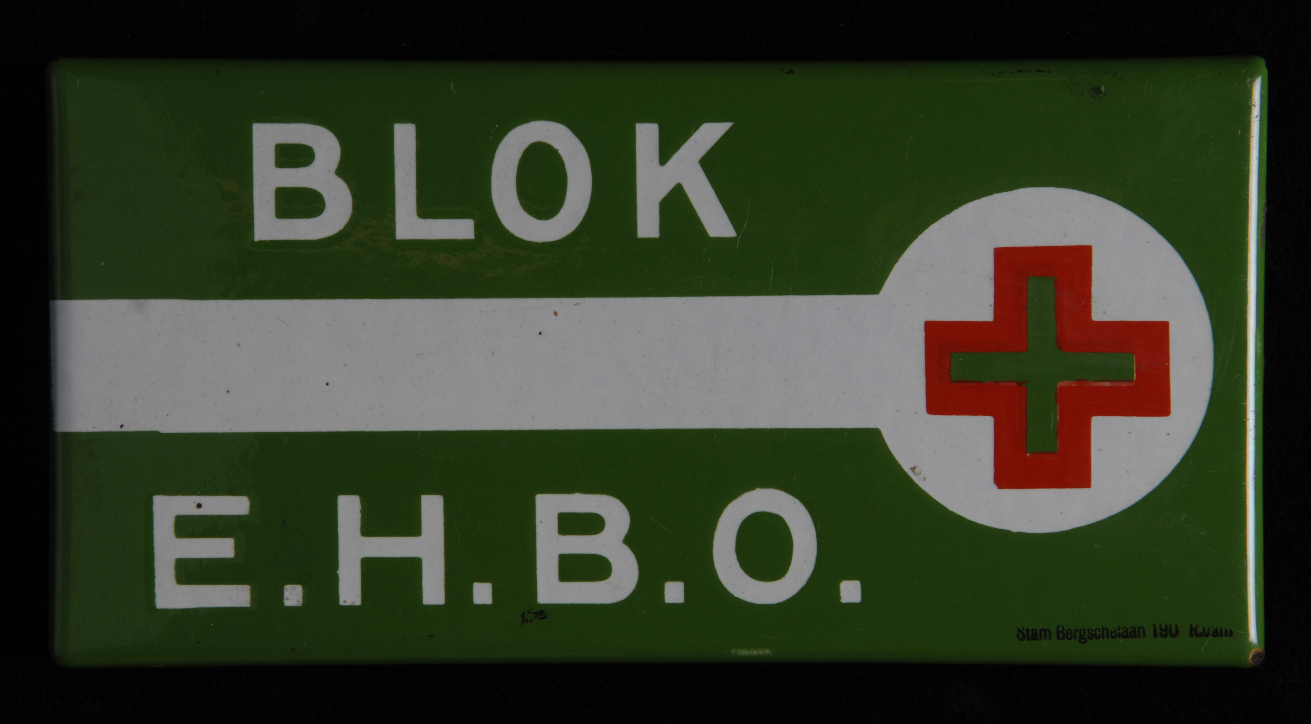 Rechthoekig groen-wit emaille gevelbordje met "BLOK BRANDWEER"