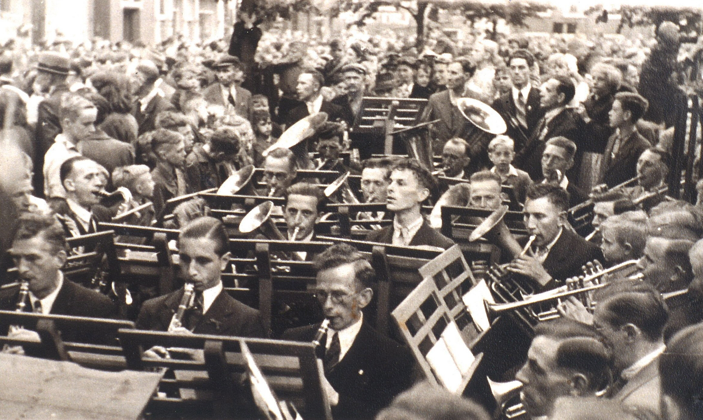 Bevrijdingsfeest in de Patijnestraat. De harmonie moet het doen met een een mengeling van instrumenten. Dit omdat in de oorlog deze voor de Duitsers op diverse plaatsen waren verstopt en daardoor ook de kwaliteit ervan best achteruit zal zijn gegaan. Ook ontbreken nog de uniformen van het harmoniekorps.