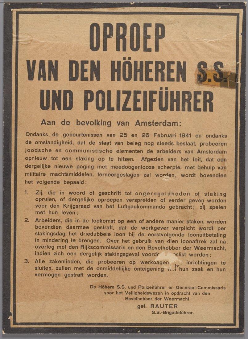 Na de Februaristaking werden de Amsterdammers gewaarschuwd niet meer tot 'ongeregeldheden of staking' op te roepen. Zij die dat wel zouden doen, 'spelen met hun leven'. Arbeiders mochten, op straffe van loonsinhouding, niet meer staken en ondernemers mochten hun winkels niet sluiten, op straffe van onteigening van hun zaak en vermogen.