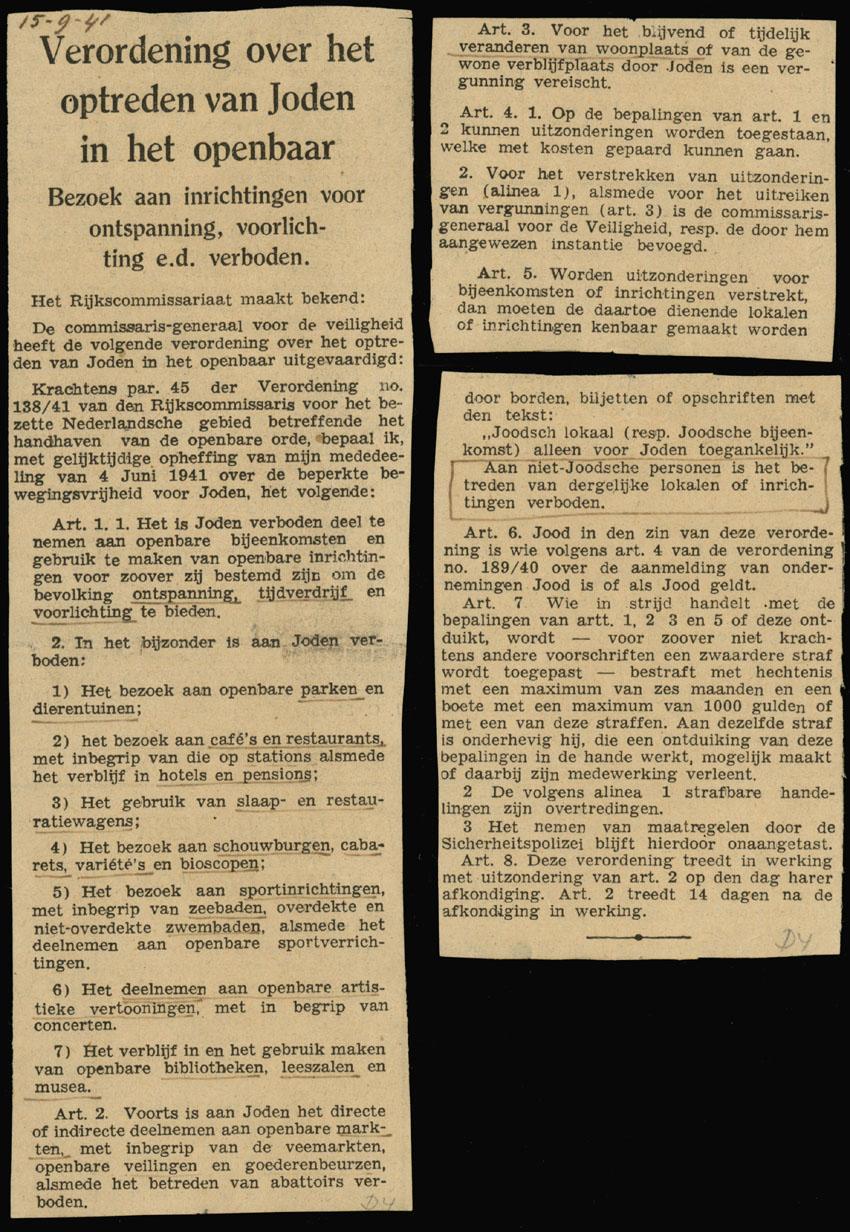Krantenbericht van 15 september 1941 waarin bekend wordt gemaakt dat volgens verordening 138/41, joden geen inrichtingen voor ontspanning (zoals parken, café's, schouwburgen, bioscopen, zwembaden) en voor informatie (zoals bibliotheken, musea) meer mogen bezoeken.