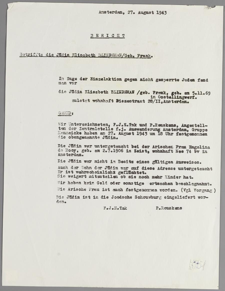 Verslag m.b.t. arrestatie van ondergedoken jodin Elisabeth Blindeman-Frank, 1943
