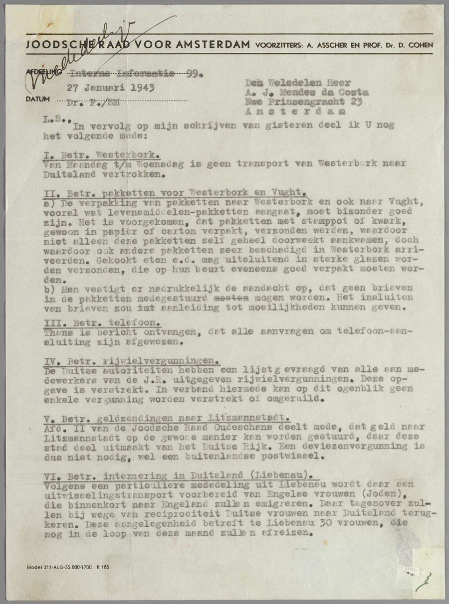 Mededeling van de onderafdeling 'Interne informatie' van de Joodse Raad aan A.J. Mendes da Costa, lid van de Joodse Raad, over transporten naar Westerbork, postpakketten, enz., 1943