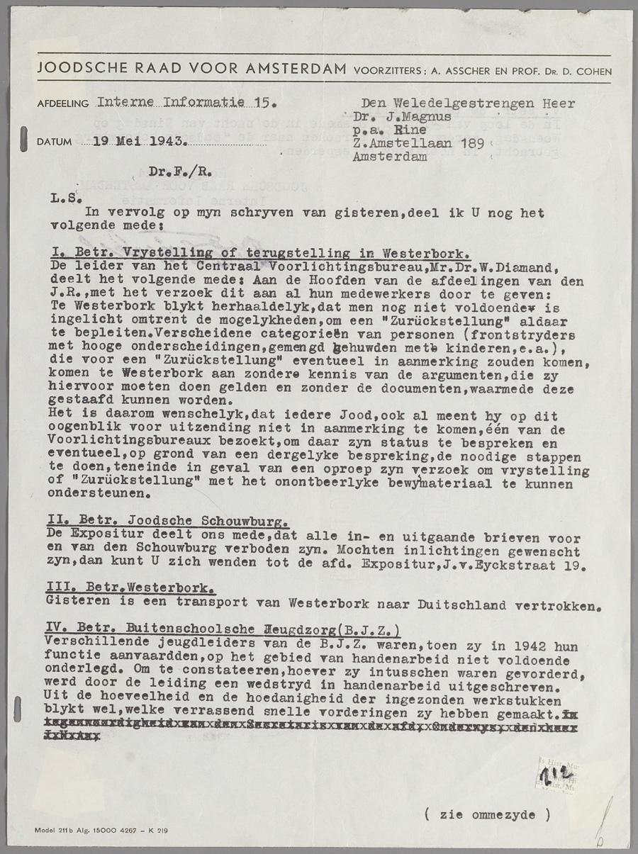 Interne informatie van de Joodse Raad aan J. Magnus over transporten van en naar Westerbork, de Hollandsche Schouwburg en de mogelijkheid van vrijstelling voor joden in Westerbork, mei 1943