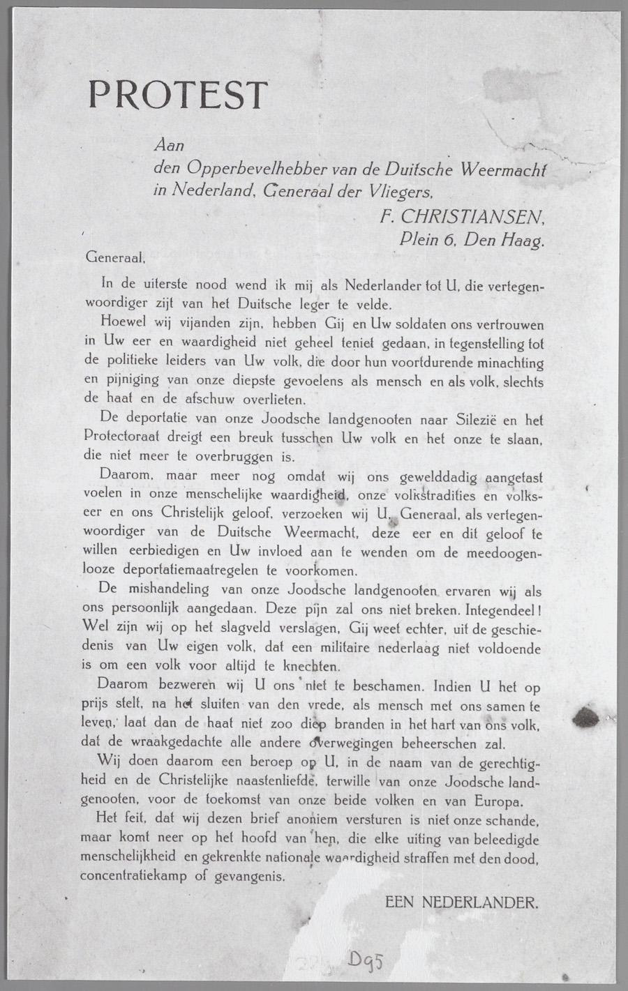 Verzoek van 'een Nederlander' aan de Duitse generaal Christiansen de deporatie van de Nederlande joden te doen stoppen