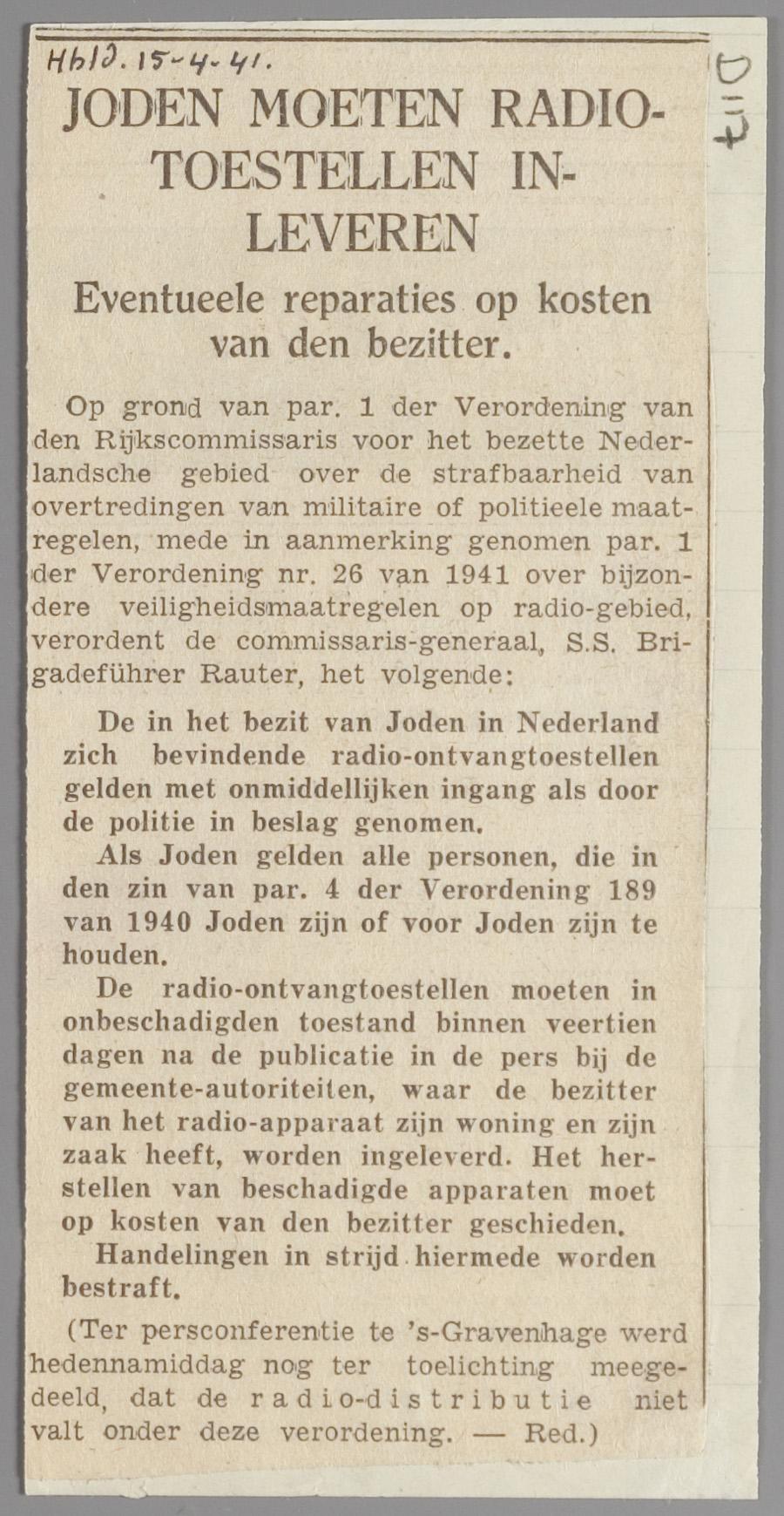 Krantenartikel met bericht over inleveringsplicht radiotoestellen, april 1941