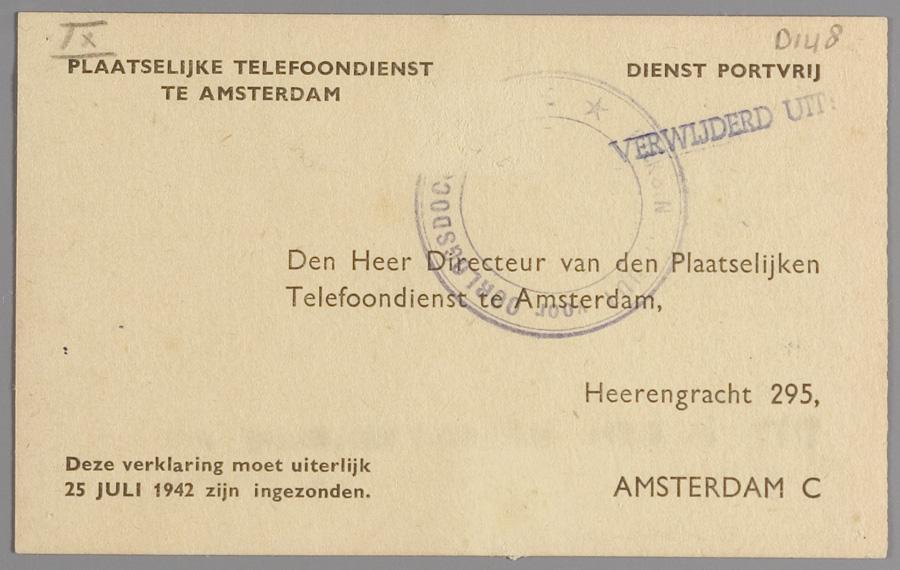 Op een verder niet ingevulde verklaring, dat de desbetreffende contractante van het Amsterdamse telefoonnet wel of geen jood is, op zijn of haar toestel en aansluiting wel of geen joden laat telefoneren, etcetera, heeft iemand in grote blokletters geschreven: 'dit is een hemeltergende schande. waarom leent de directeur zich hiertoe ?'