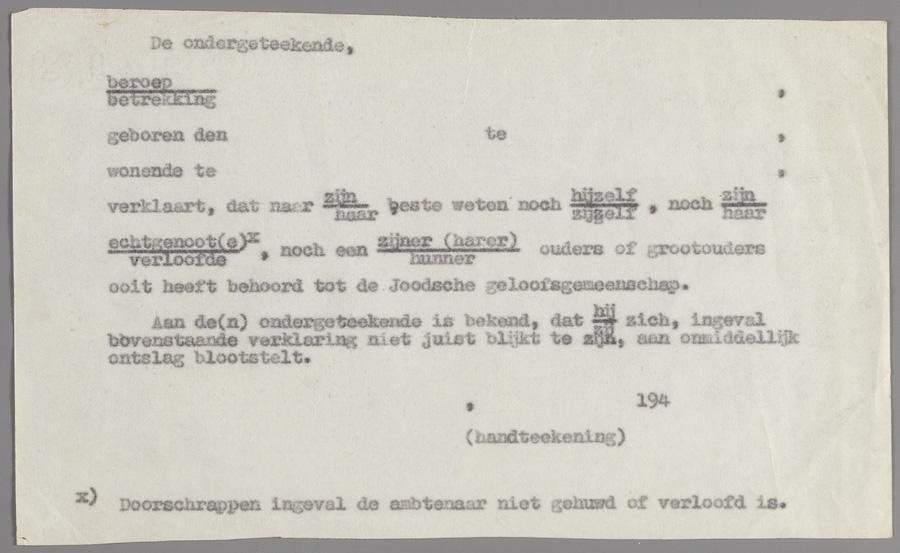 Niet ingevulde arierverklaring zoals werd gebruikt in het onderwijs, 1941