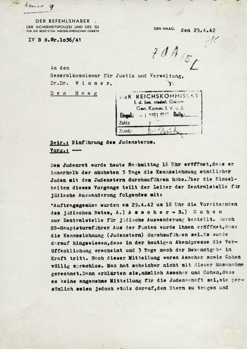 Brief van Wilem Harsten aan Friedrich Wimmer betreffende de invoering van de jodenster, april 1942
