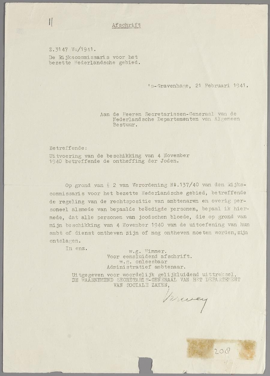 Afschrift van een brief aan secretarissen-generaal van Nederlandse Departementen van Algemeen Bestuur inzake het ontslaan van joodse ambtenaren, op basis van Verordening 137/1940, februari 1941