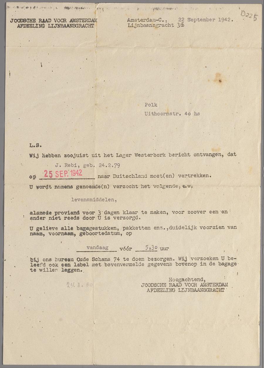 Verzoek van de Joodse Raad om proviand te leveren voor J. Rebi die op 25 september vanuit Westerbork naar 'Duitschland' moest vertrekken, september 1942