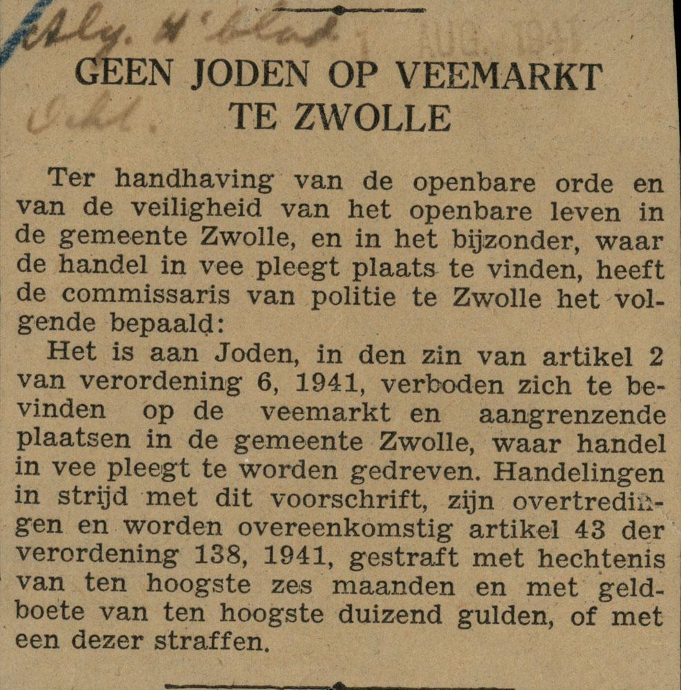 Krantebericht uit het Algemeen Handelsblad met bepaling van de Zwolse politie dat het joden verboden is zich op de veemarkt te bevinden, augustus 1941